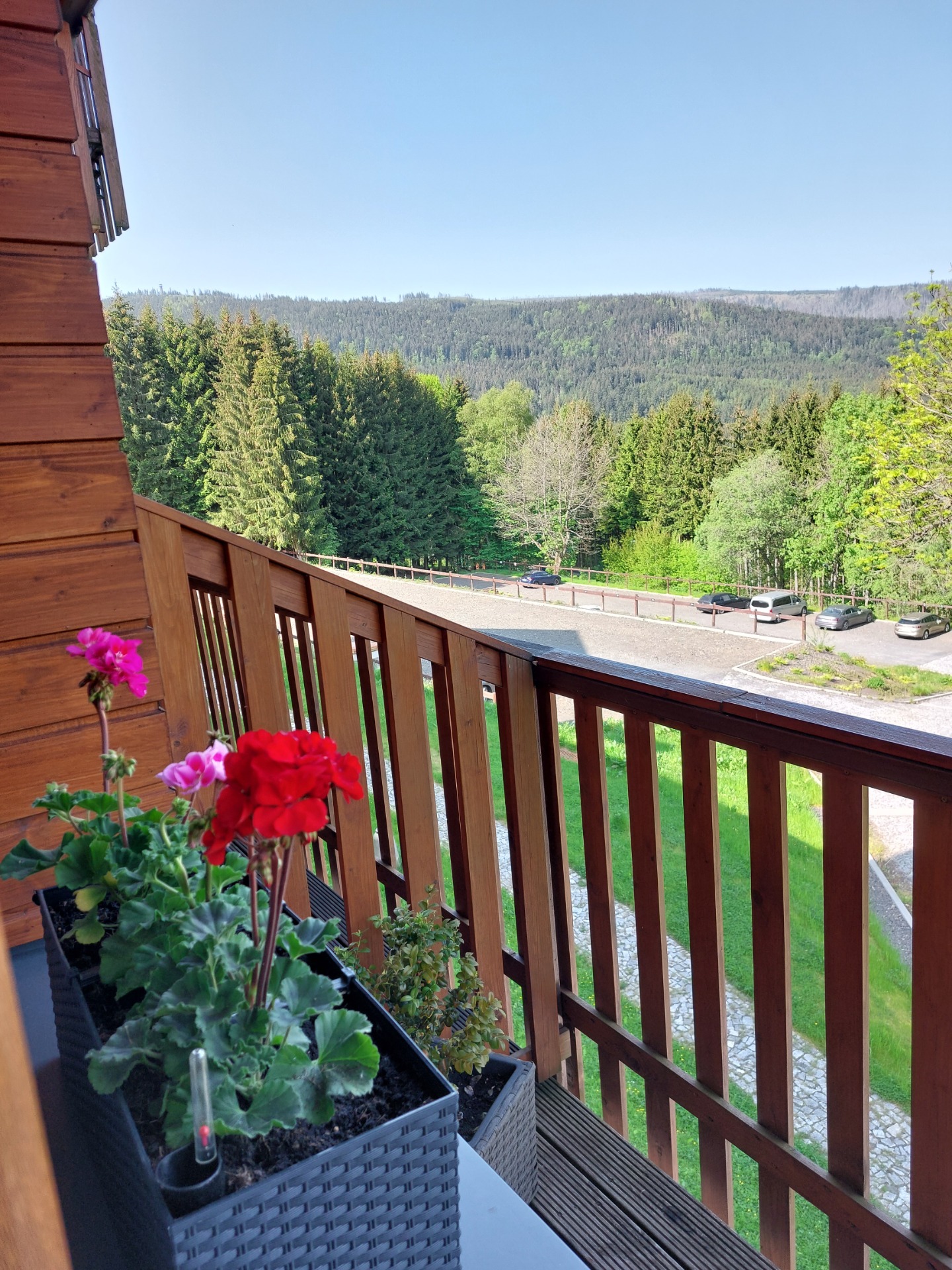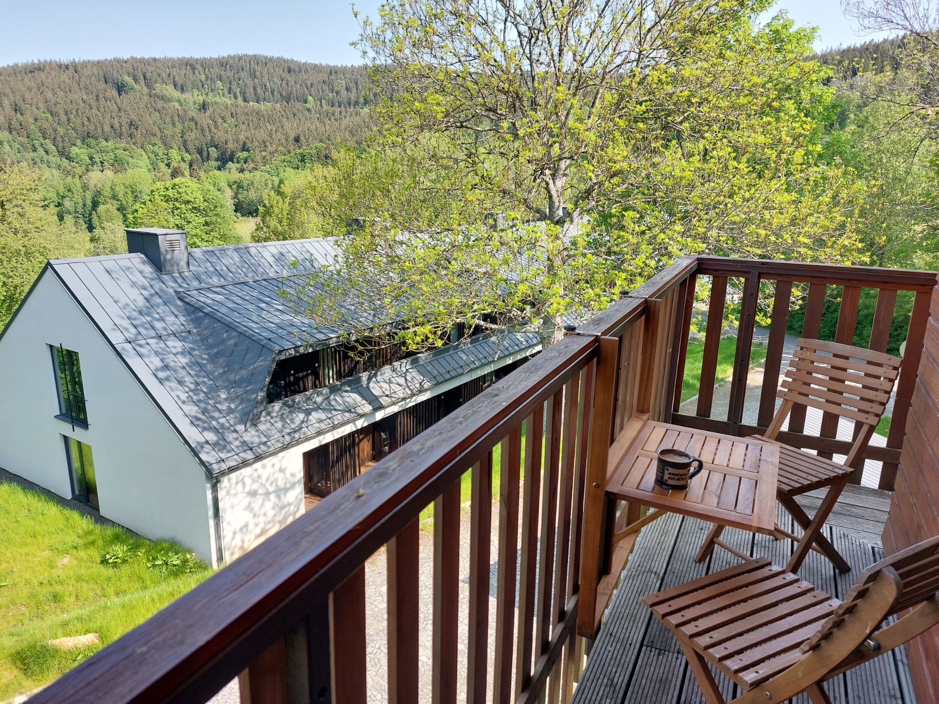 - Výhled na 3 strany (3 balkony a 1 francouzské okno) . Na balkonu do údolí je posezení se stolečkem, kde je mimo jiné krásný výhled na Ostrý, Špičák a Jezerní horu. Posedět můžete i na druhé straně (u ložnic).